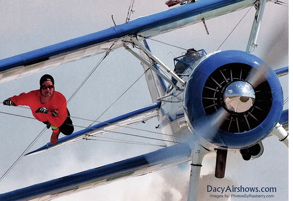The wingwalking routine was just one act presented by the “Dacy Family Airshow Team,” which included Dave’s brother, Phil, announcing the acts; Phil’s wife, Julia, who took care of logistics; Dave’s sister, Susan, who flew a solo routine in her own 450 Super Stearman; and many other top performers including “Flying Irishman” Joe Dooley, “Flying Farmer” Sid Nelson, and Vlado Lenoch in his P-51 Mustang, “Moonbeam McSwine.”